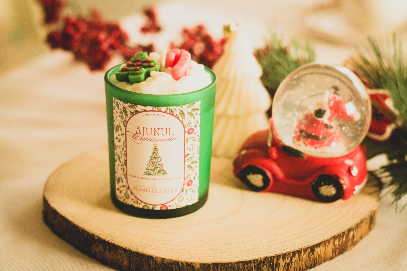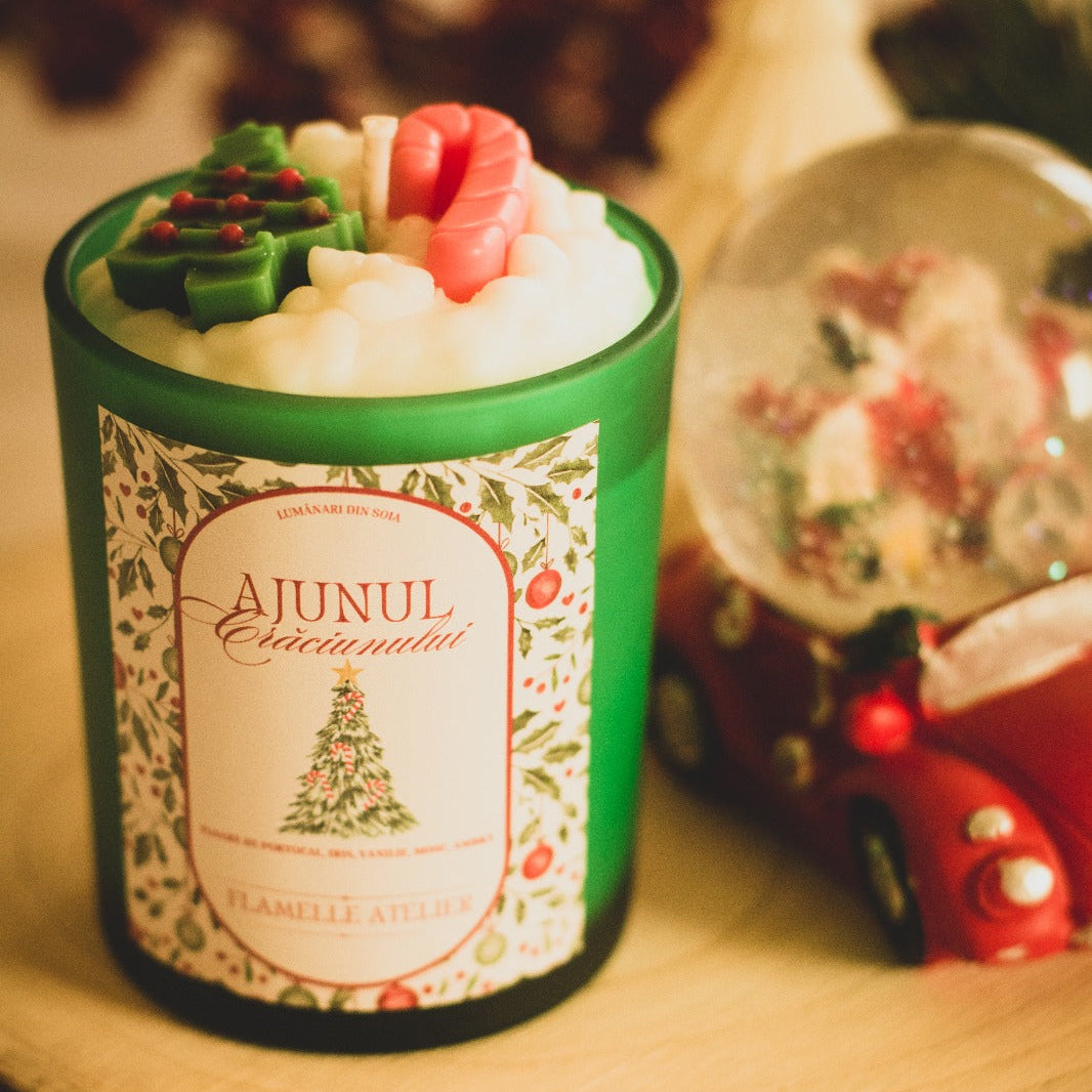 Este turnată manual într-un pahar din sticlă, verde și arde aproximativ 48 de ore, oferindu-ți o atmosferă caldă și reconfortantă pentru perioada sărbătorilor.
