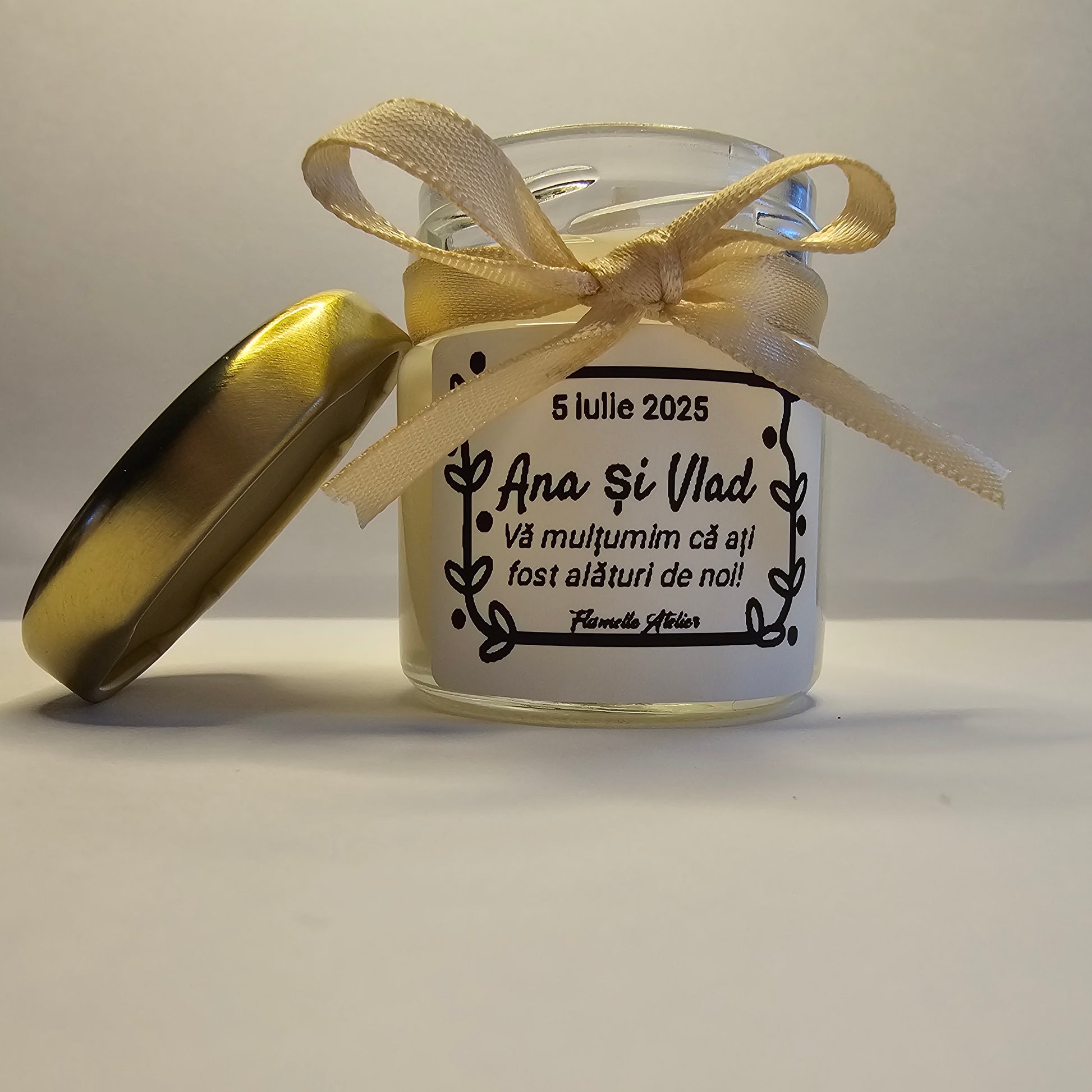 Fie că pregătești un botez plin de emoție sau o nuntă cu suflet, mărturiile Flamelle Atelier în recipiente mici, de sticlă, adaugă o notă de rafinament, simplitate și căldură.