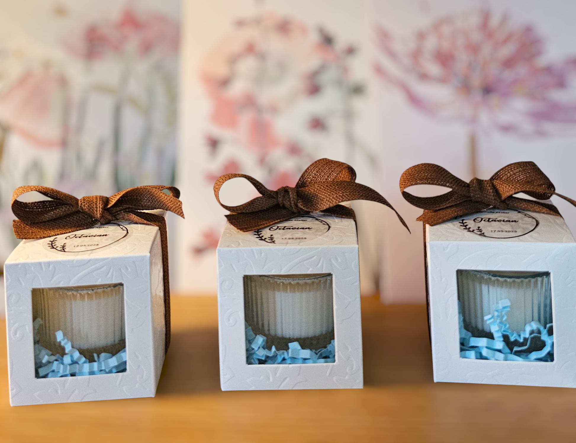 Fie că pregătești un botez plin de emoție sau o nuntă cu suflet, mărturiile Flamelle Atelier în recipiente mici, de sticlă, adaugă o notă de rafinament, simplitate și căldură.