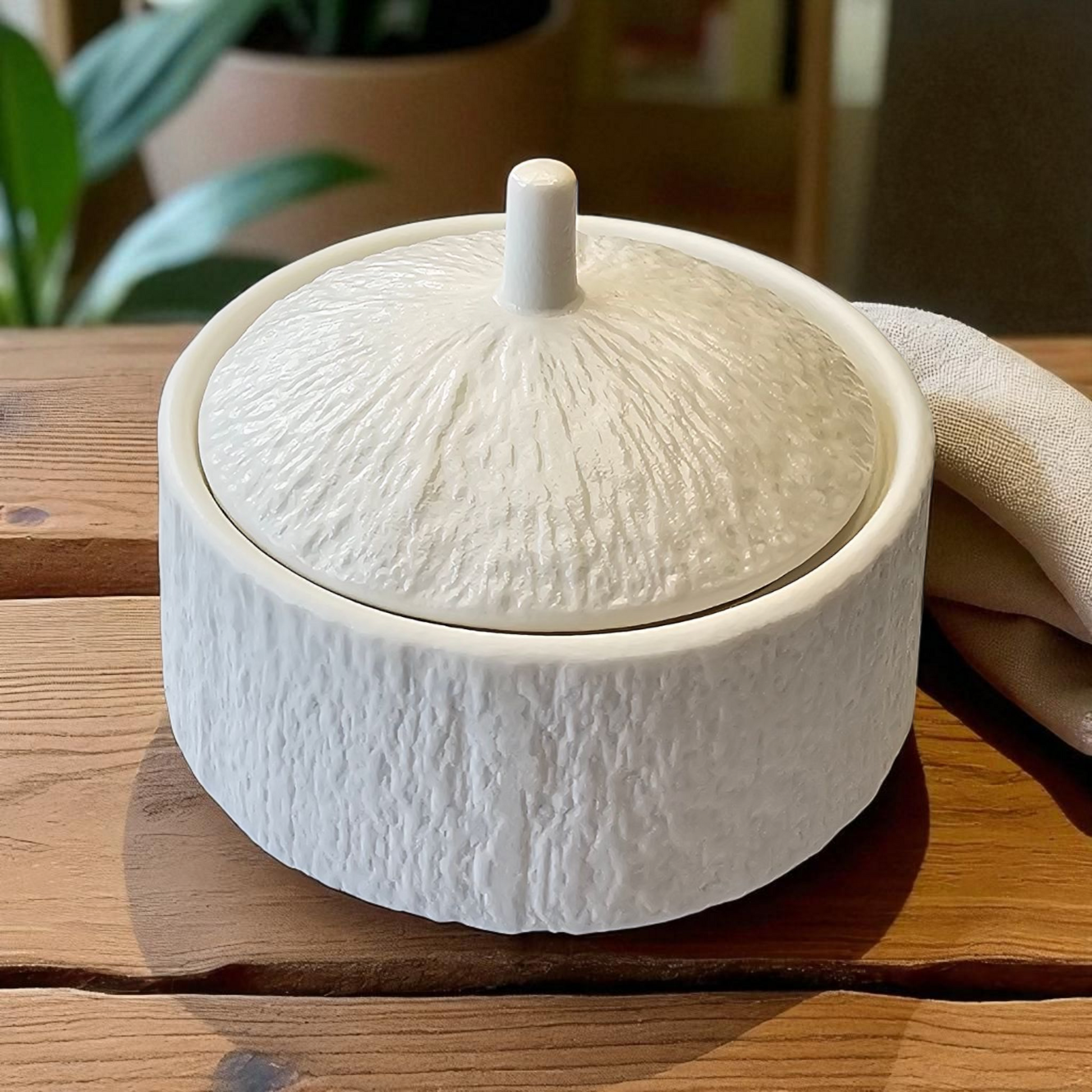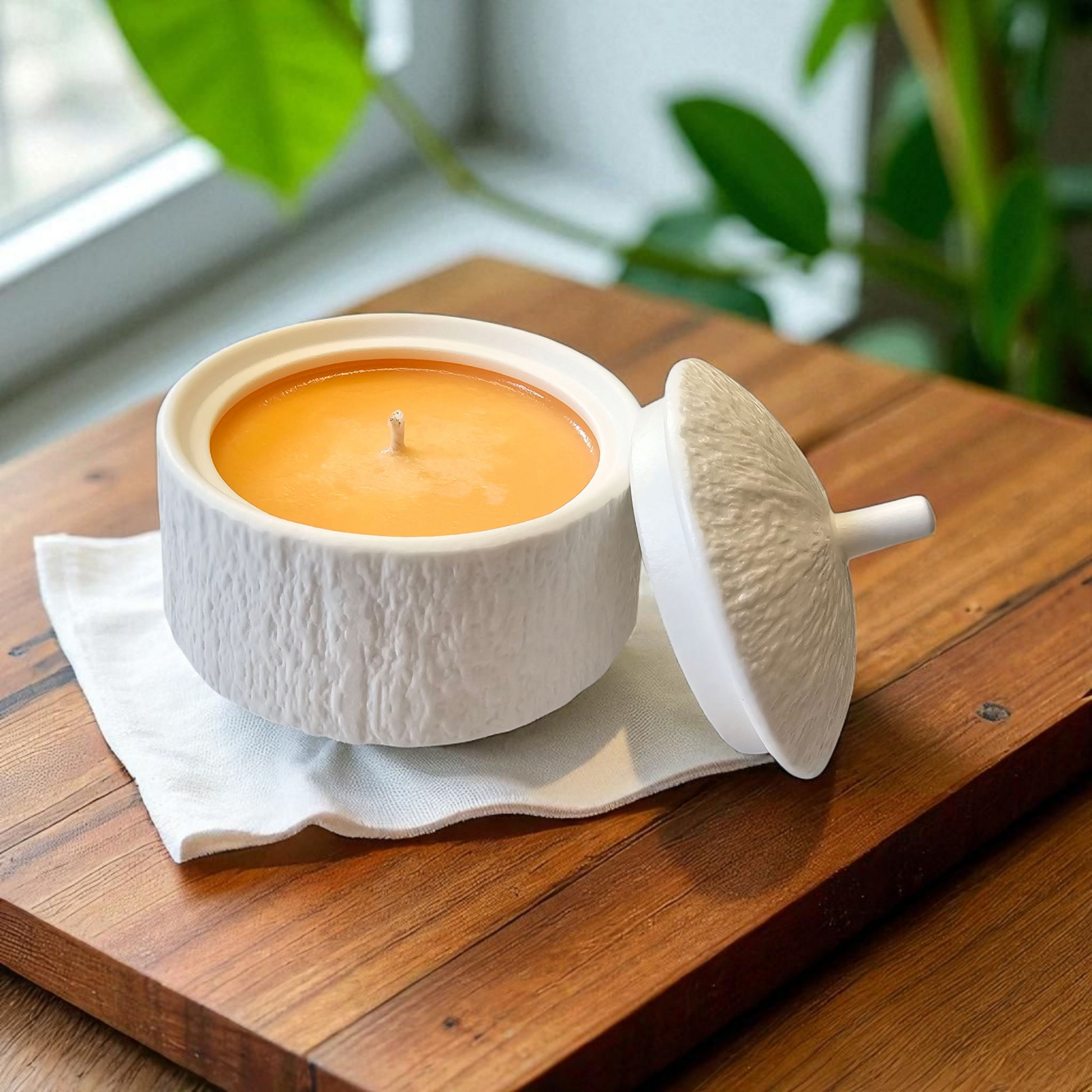 Adaugă un strop de rafinament în decorul casei cu această lumânare turnată manual, învelită într-un recipient ceramic texturat, cu capac.