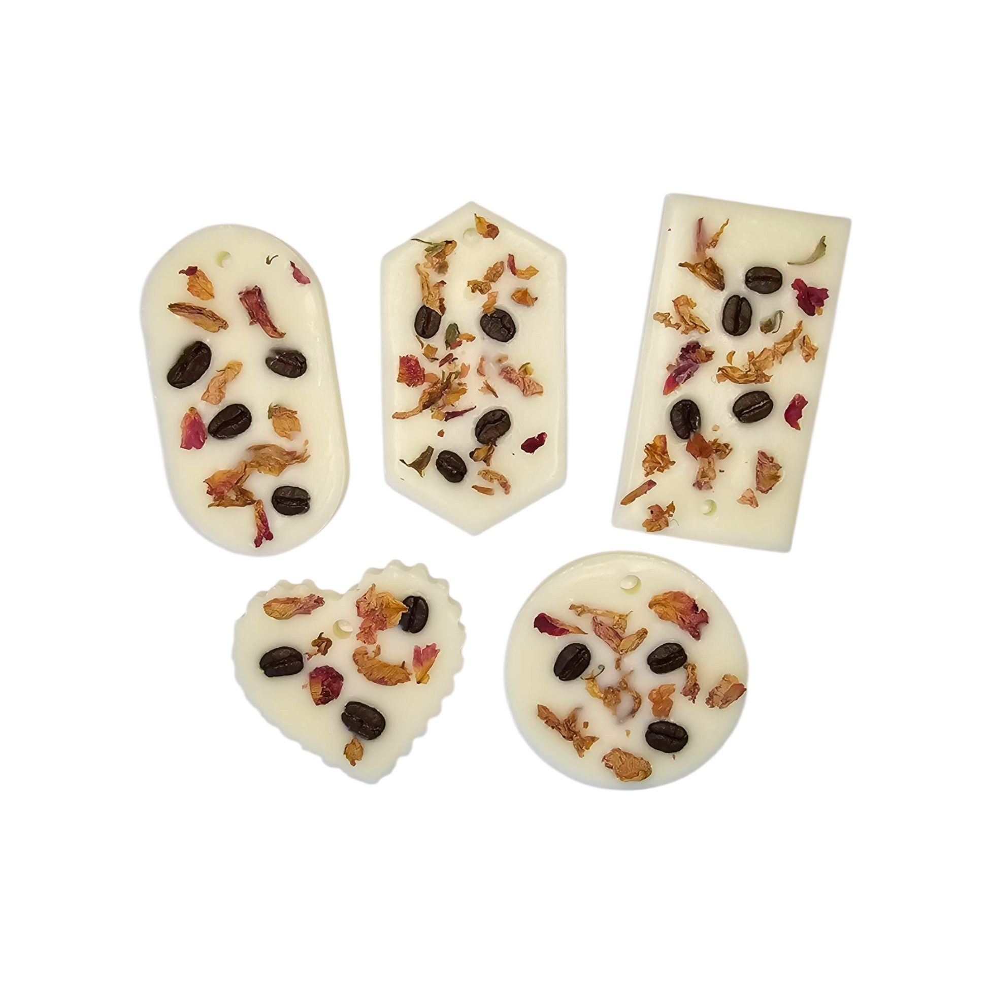 Fiecare tabletă parfumată este turnată manual din ceară de soia, decorată cu boabe de cafea și petale sfărâmate de trandafir, ce durează 2-3 luni, pentru a-ți reîmprospăta spațiul cu eleganță și armonie. Poate fi agățată în dulap sau plasată între haine, pe un șervețel.