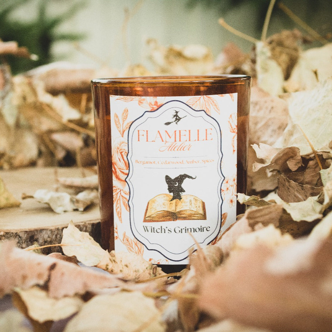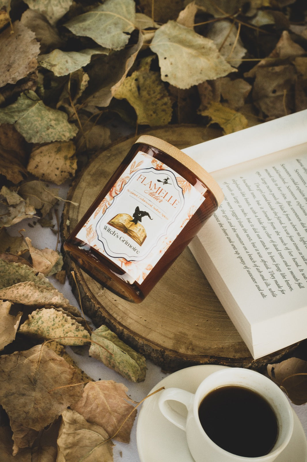 Această lumânare s-a născut din fascinația pentru misterul vechilor manuscrise și al cunoașterii ascunse. Imaginează-ți un grimoar de vrăjitoare, plin de formule uitate, scris cu cerneală veche pe pagini îngălbenite, păstrat lângă un foc mocnit. Atmosfera e una de taină, de alchimie, de contemplare profundă.
