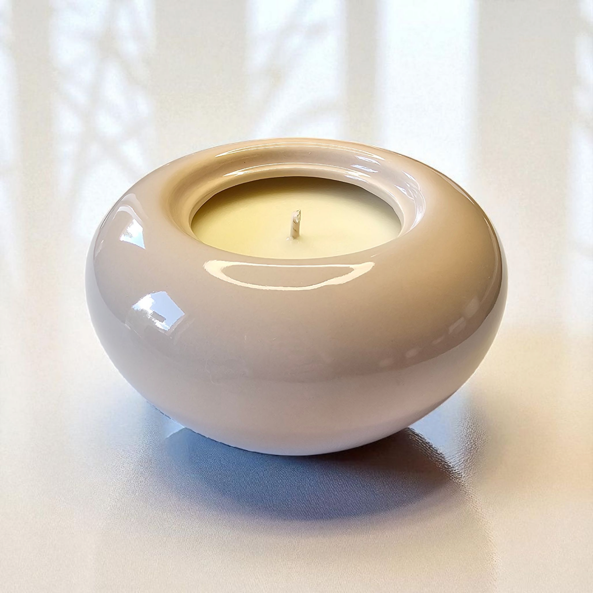 Lumânare turnată într-o formă ceramică simplă, elegantă și un design minimalist, ce invită la calm, echilibru și liniște profundă.